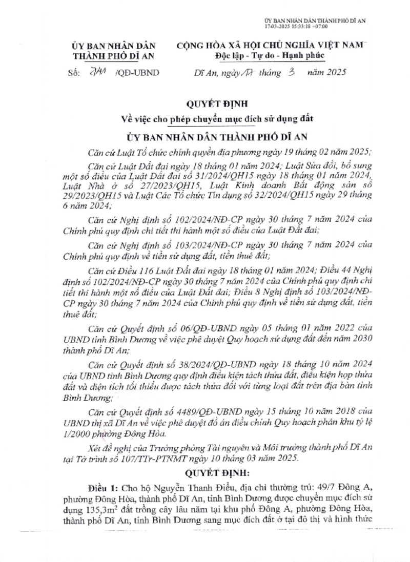 741.QD Về việc cho phép chuyển mục đích sử dụng đất